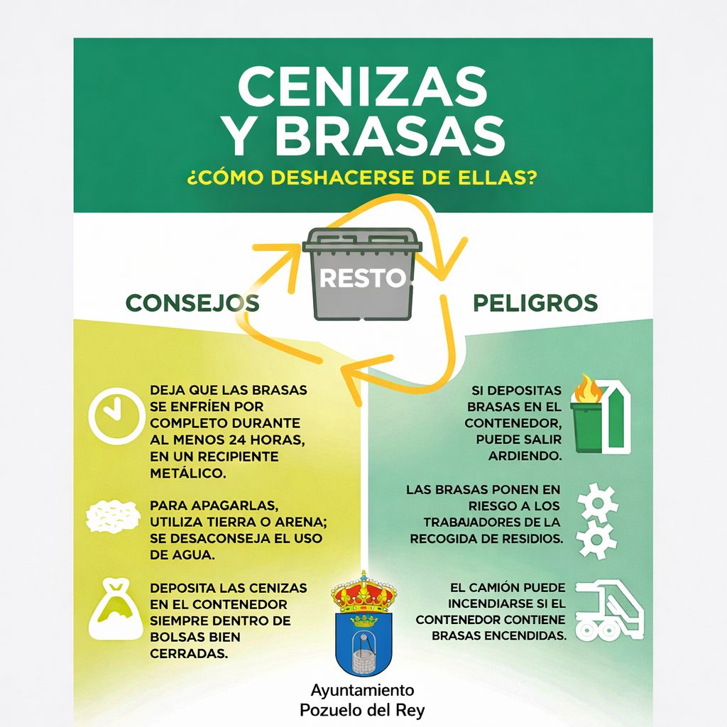 El Ayuntamiento de Pozuelo del Rey informa de que en el día de hoy se ha producido un incendio en un camión de recogida de residuos como consecuencia del depósito indebido de brasas aún encendidas en un contenedor.